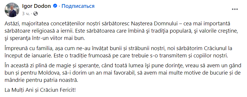 Cu acest prilej, fostul șef de stat Igor Dodon a venit cu un mesaj de felicitare.