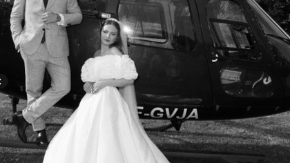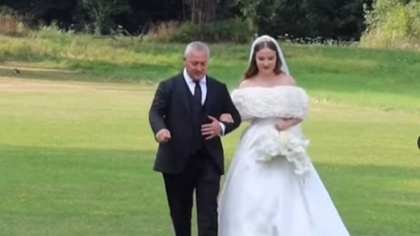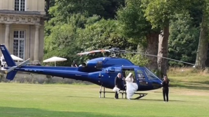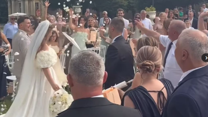 Momentul de senzație a fost atunci când mireasa a sosit pe pajiștea din fața palatului cu elicopterul, însoțită de tatăl ei, un tablou desprins parcă dintr-un film romantic.
