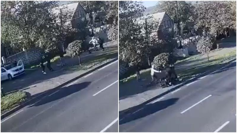 Din imaginile postate pe rețele se observă mai multe persoane în apropiere de o poartă, cum discută, apoi se iau la bătaie.