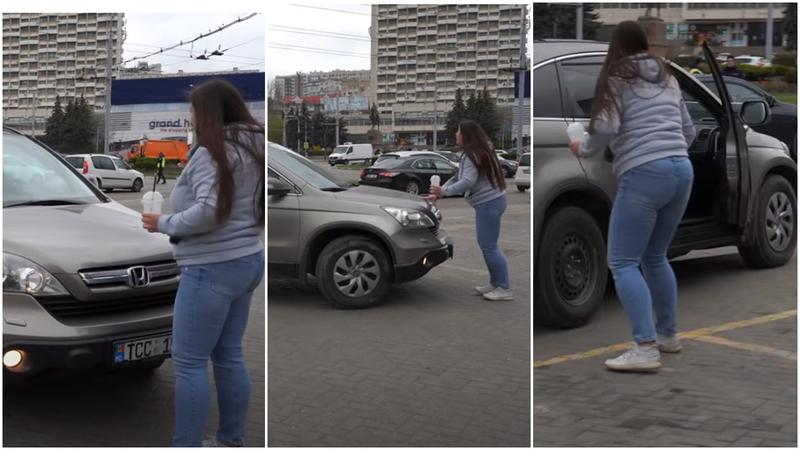 Șoferul a încercat să iasă la carosabil, iar activista a insistat, lovind în continuare mașina, care era în mișcare: „Înapoi dă! Придурок!”