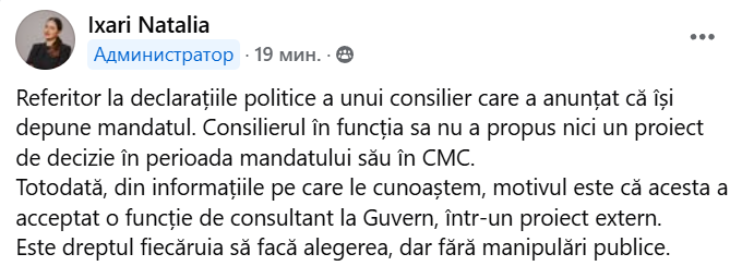 Este dreptul fiecăruia să facă alegerea, dar fără manipulări publice”, a scris Natalia Ixari, purtătoarea de cuvânt a lui Ion Ceban.