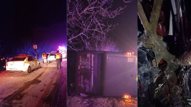 16 persoane au ajuns la spital, după ce șoferul unui autocar de pe ruta Kiev-Chișinău, cu 68 de pasageri la bord, într-o curbă, pe carosabil acoperit cu zăpadă, ar fi pierdut controlul mijlocului de transport și s-a răsturnat, după care autocarul a fost proiectat într-un copac, anunță Poliția.