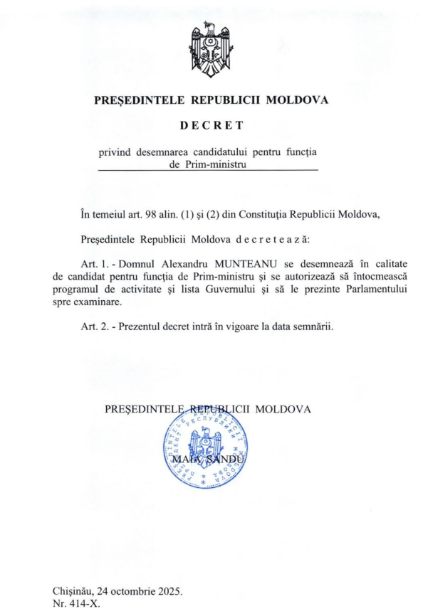 „Alexandru Munteanu se desemnează în calitate de candidat pentru funcția de Prim-ministru și se autorizează să întocmească programul de activitate și lista Guvernului și să le prezinte Parlamentului spre examinare”, se arată în Decret.