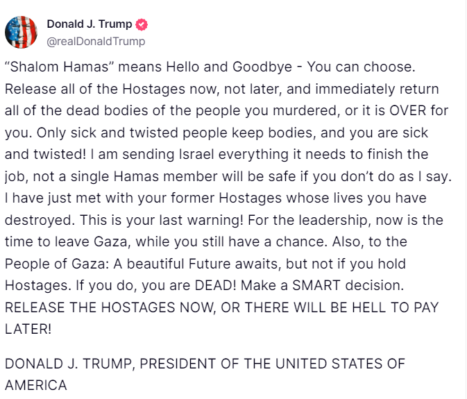 El a mai spus că va trimite Israelului „tot ce are nevoie pentru a termina treaba” în Gaza şi a cerut ca Hamas „să elibereze toţi ostaticii acum, nu mai târziu”, inclusiv rămăşiţele ostaticilor morţi. Altfel, „va fi sfârşitul pentru voi”, transmite Trump membrilor Hamas.