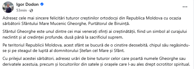 „Adresez cele mai sincere felicitări tuturor creștinilor ortodocși din Republica Moldova cu ocazia sărbătorii Sfântului Mare Mucenic Gheorghe, Purtătorul de Biruință.