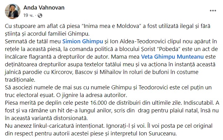 Nu anexez linkul-caricatură intenționat. Ignorați-l și voi. Îl voi posta pe cel original din respect pentru autorii acestei piese și interpretul Ion Suruceanu”, a scris Anda Vahnovan.