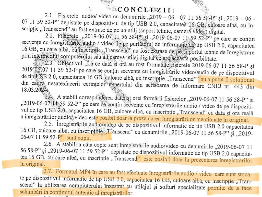 Potrivit concluziilor din raportul de expertiză, toate înregistrările sunt copii, nu originale și nu s-a putut stabili dacă datele/orele înregistrărilor corespund realității: „Este posibil doar la prezentarea înregistrărilor în original.” Totodată, au fost depistate întreruperi în înregistrările video relevante.
