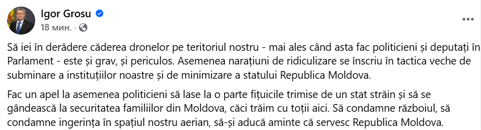 Fac un apel la asemenea politicieni să lase la o parte fițuicile trimise de un stat străin și să se gândească la securitatea familiilor din Moldova, căci trăim cu toții aici. Să condamne războiul, să condamne ingerința în spațiul nostru aerian, să-și aducă aminte că servesc Republica Moldova”, a scris Grosu pe pagina sa de Facebook.