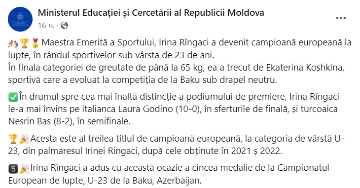Irina Rîngaci a adus, cu această ocazie, a cincea medalie de la Campionatul European de lupte, U-23 de la Baku, Azerbaijan”, comunică MEC.