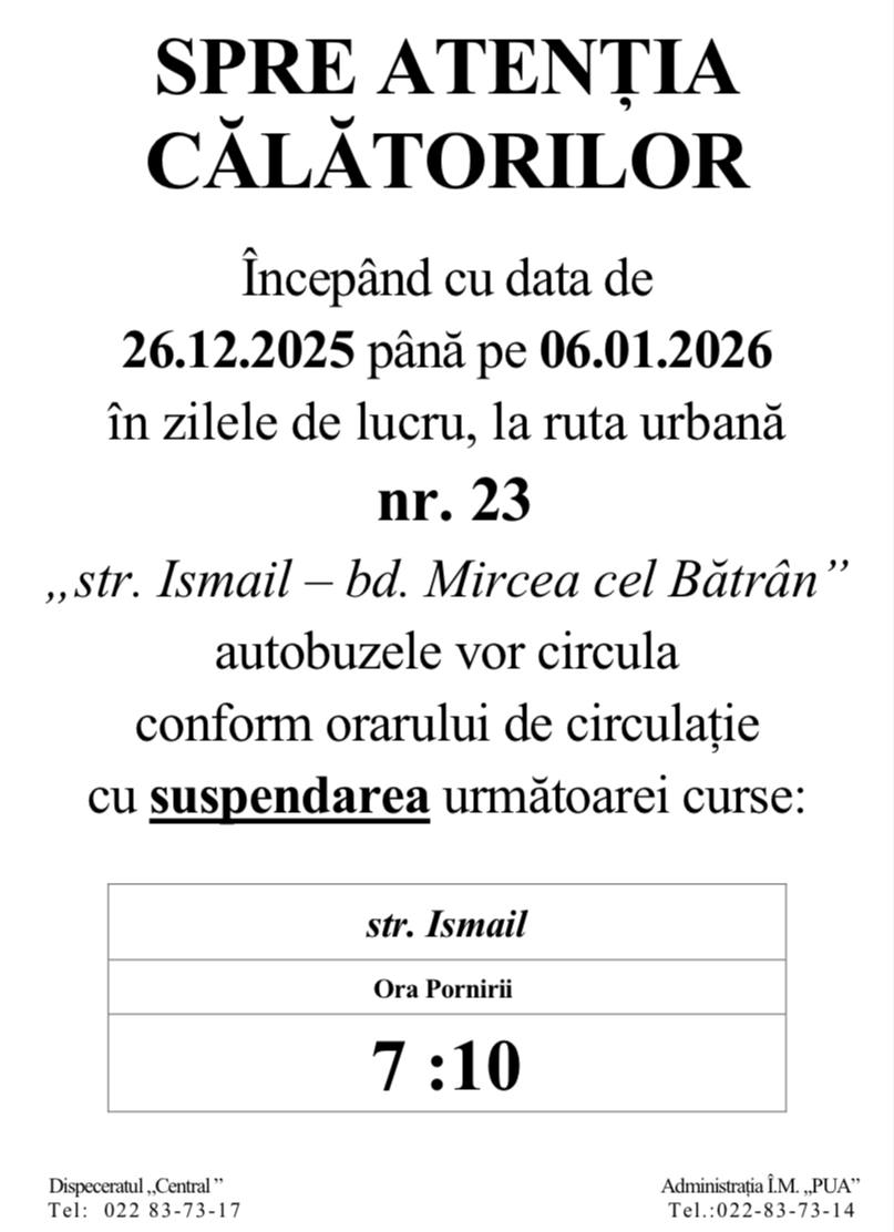 Potrivit inormațiilor, este vorba despre orarele de circulație ale rutelor de autobuz nr. 8, 9, 11, 23 și 52 în perioada 26.12.2025 – 06.01.2026.