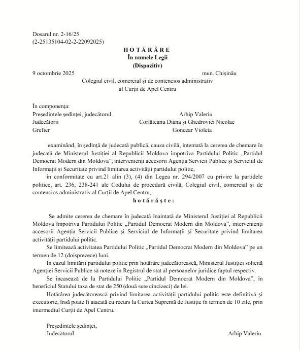 „Se admite cererea de chemare în judecată înaintată de Ministerul Justiției al RepubliciiMoldova împotriva Partidului Politic „Partidul Democrat Modern din Moldova”, intervenienți accesorii Agenția Servicii Publice şi Serviciul de Informații și Securitate privind limitarea activității partidului politic.