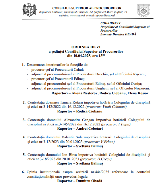 update CSP examinează, în ședință închisă, contestația domnului Alexandru Gangan împotriva hotărârii Colegiului de disciplină și etică nr.3-145/2022 din 16.12.2022 (procuror: I.Țugui).