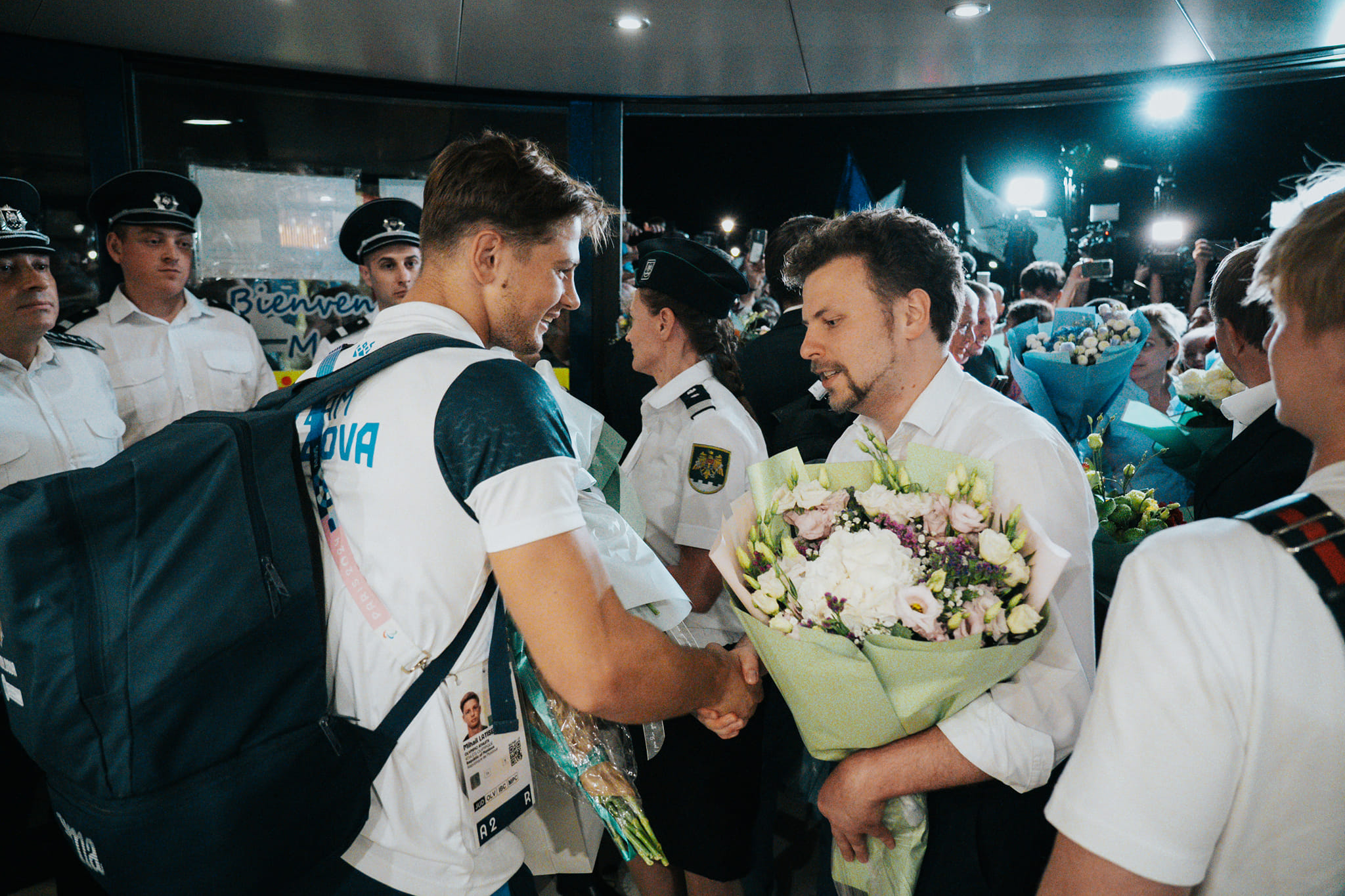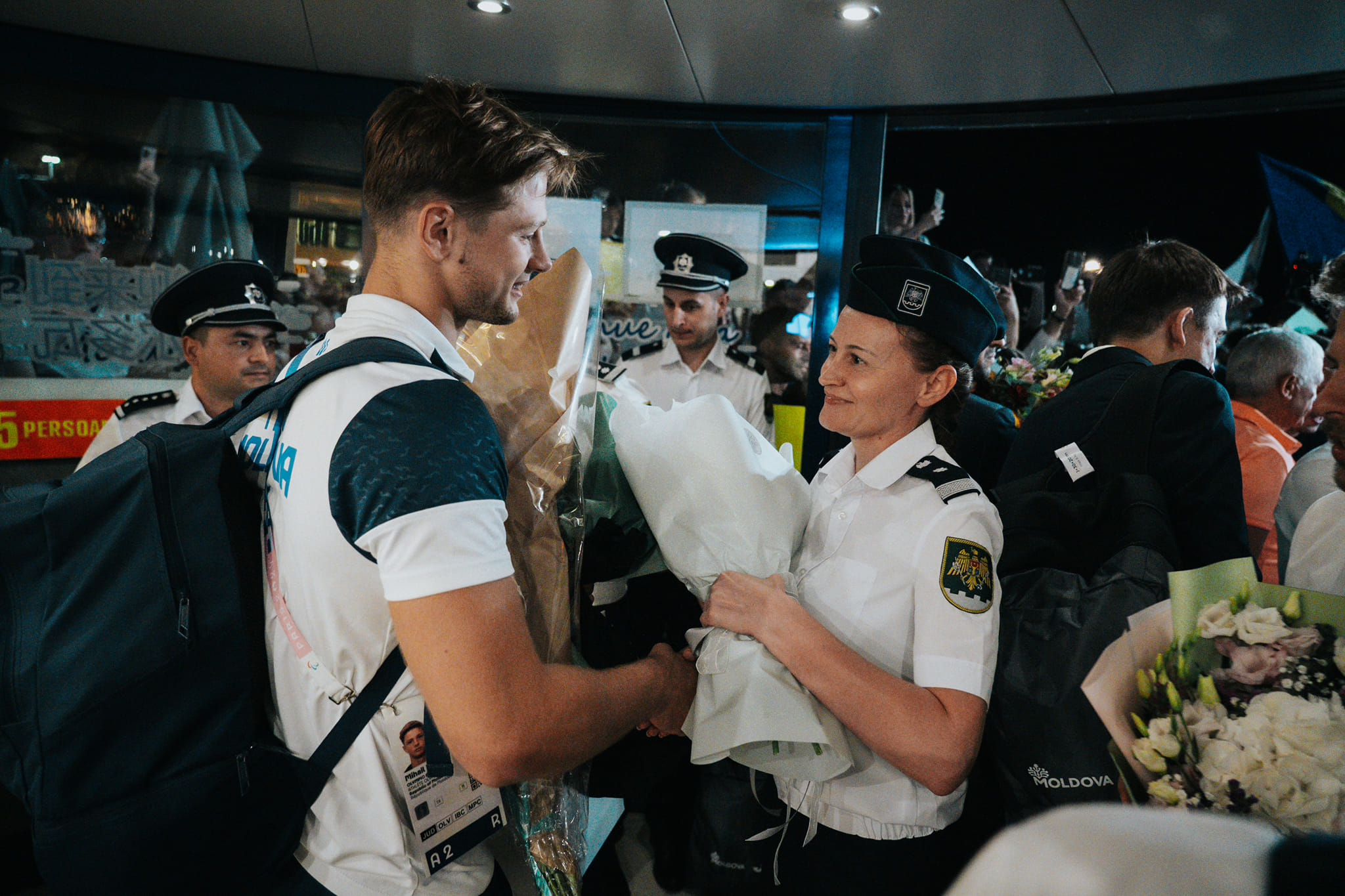 Sărbătoare la Aeroportul Chișinău ieri noapte. Judocanii Denis Vieru și Adil Osmanov, care au cucerit medalii de bronz la JO 2024 de la Paris, au ajuns acasă, fiind întâmpinați cu aplauze și flori, de zeci de oameni, printre care și copii, care scandau încontinuu „Moldova”.