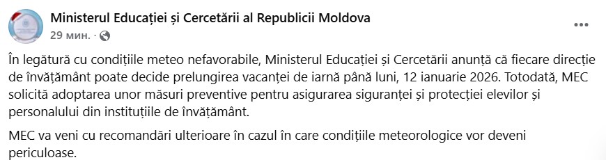 „În legătură cu condițiile meteo nefavorabile, Ministerul Educației și Cercetării anunță că fiecare direcție de învățământ poate decide prelungirea vacanței de iarnă până luni, 12 ianuarie 2026. Totodată, MEC solicită adoptarea unor măsuri preventive pentru asigurarea siguranței și protecției elevilor și personalului din instituțiile de învățământ.