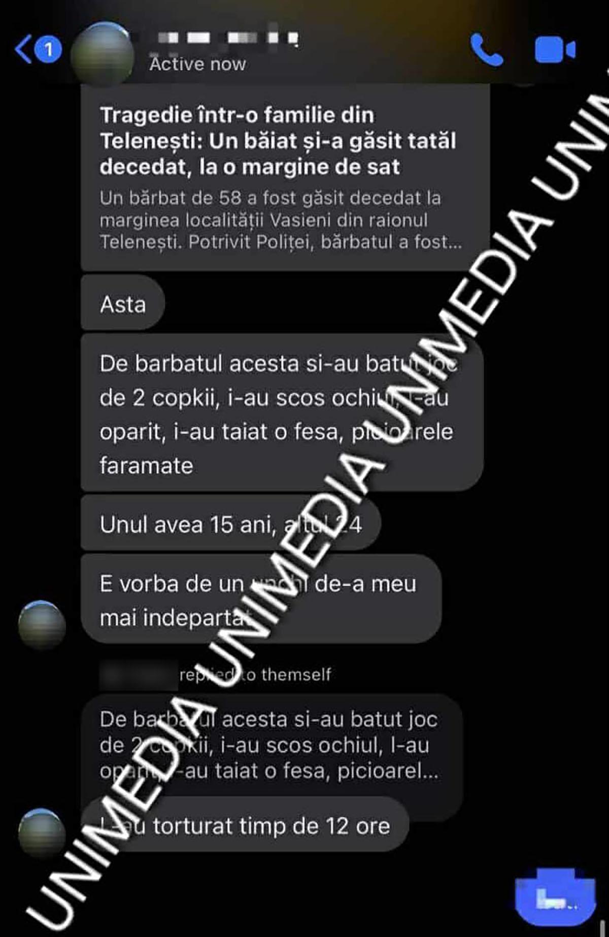 „De bărbatul acesta și-au bătut joc doi copii, de 15 și 24 de ani... i-au scos ochiul, l-au opărit, l-au tăiat și i-au rupt picioarele. L-au torturat 12 ore”, se arată într-un mesaj trimis la adresa redacției UNIMEDIA.