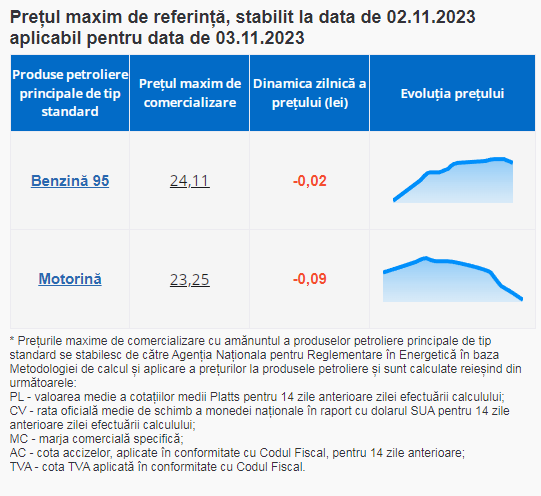 Costul benzinei și motorinei se modifică nesemnificativ, potrivit cifrelor de referință, publicate de Agenția Națională pentru Reglementare în Energetică, valabile pentru mâine.