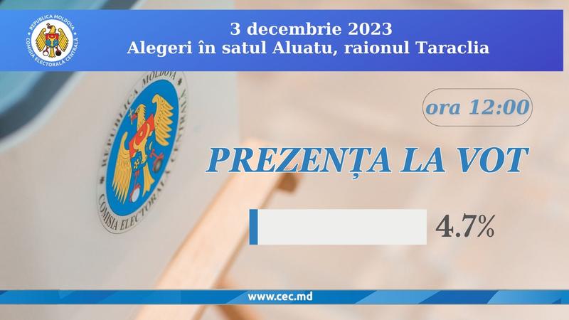 Către ora 12:00, a fost înregistrată o participare de 4,69% (36 de alegători), dintre aceștia 20 sunt bărbați și 16 femei.