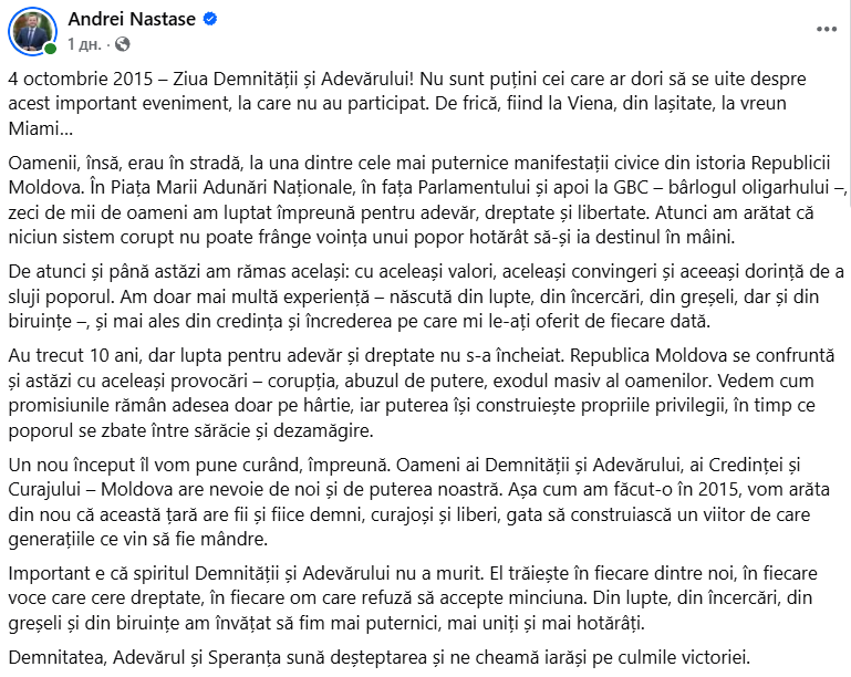 Demnitatea, Adevărul și Speranța sună deșteptarea și ne cheamă iarăși pe culmile victoriei”, a scris Năstase pe rețele.