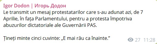 „Le transmit un mesaj protestatarilor care s-au adunat azi, de 7 aprilie, în fața Parlamentului, pentru a protesta împotriva abuzurilor dictatoriale ale Guvernării PAS.