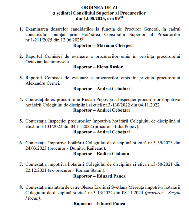 (update) CSP examinează, în ședință închisă, contestația înaintată de către Olesea Lisnic și Svetlana Mereuța împotriva hotărârii Colegiului de disciplină și etică nr.3-13/2024 din 08.11.2024 (procuror - Sergiu Mocan).