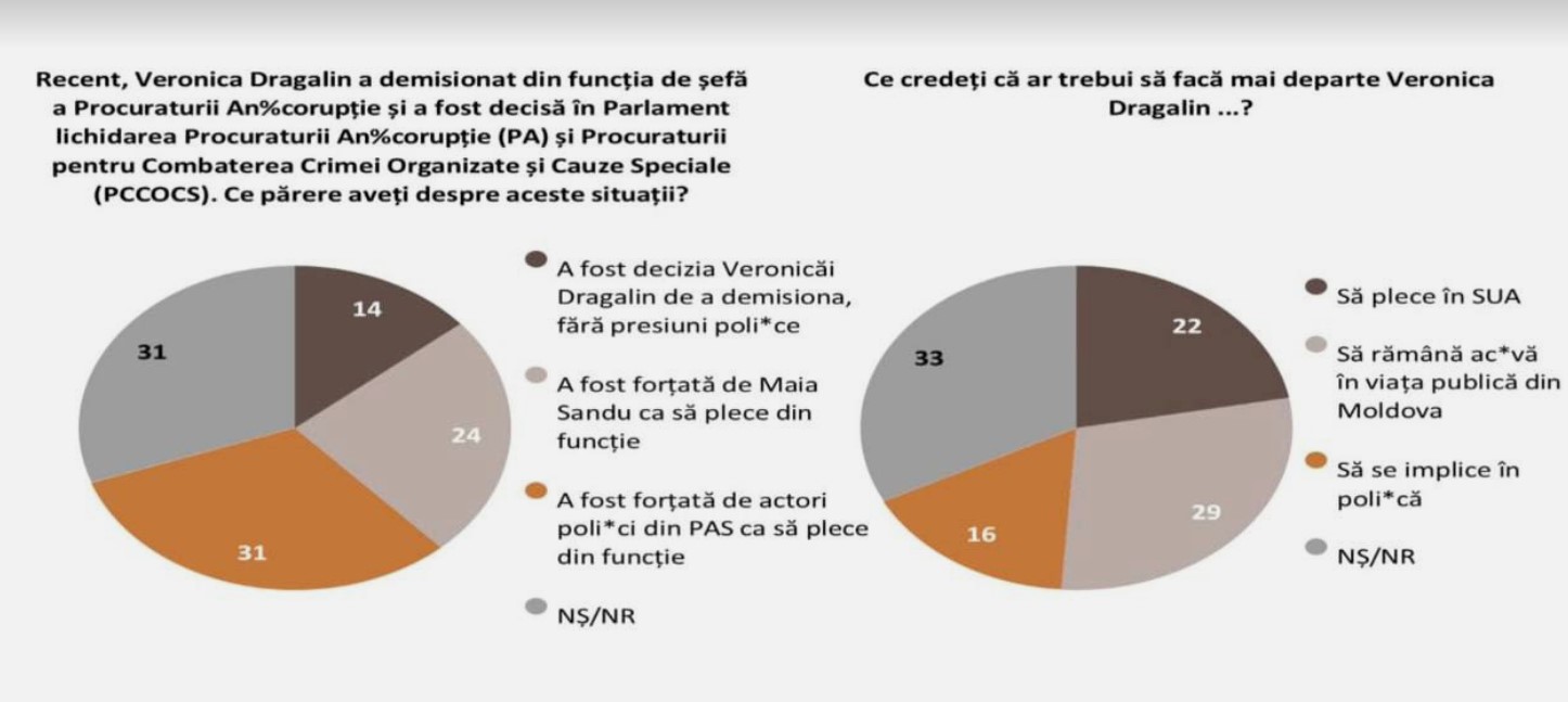 31% din cei intervievați cred că Veronica Dragalin a fost forțată să plece de politicieni din PAS, 24% susțin că Maia Sandu a forțat-o. Totodată, 14% cred că a fost decizie proprie, iar 31% nu știu sau nu au răspuns