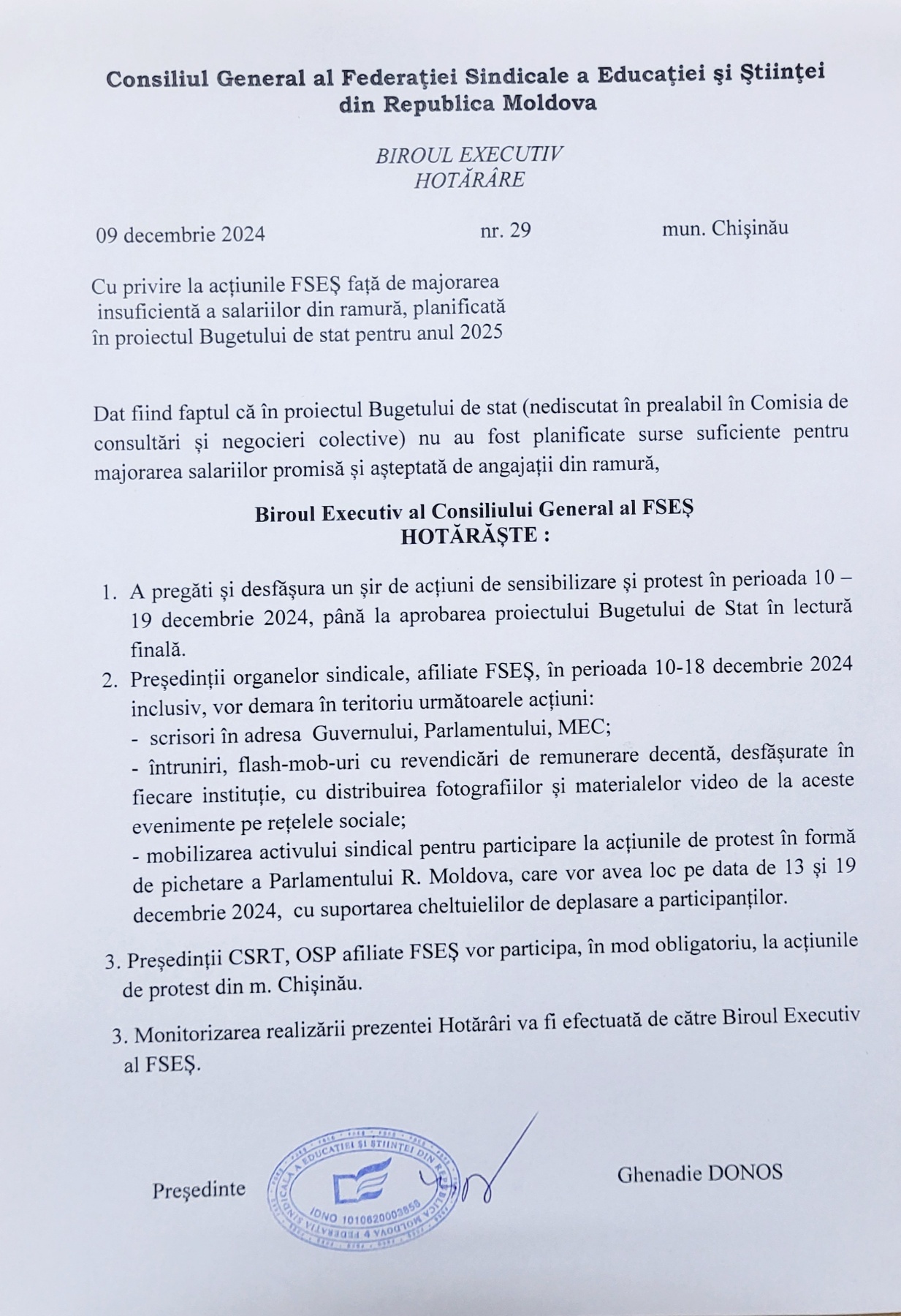Federația Sindicală a Educației și Științei menționează că au avut loc două ședințe la care s-a examinat situația din colectivele pedagogice, s-a consultat opinia activului sindical și s-a făcut bilanțul la zi a negocierilor purate, cu factorii decizionali, pe marginea proiectului Bugetului pentru anul 2025.