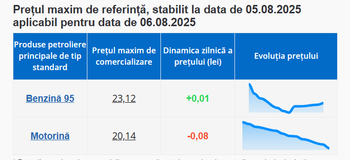 Agenția Națională pentru Reglementare în Energetică (ANRE) a afișat noile prețuri la carburanți pentru mâine, 6 august. Astfel, motorina va fi mai ieftină cu 8 bani, iar benzina - mai scumpă cu 1 bănuț.