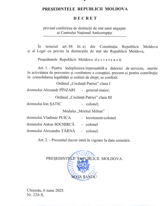 Șefa statului a semnat pe 6 iunie 2025 un decret prin care acordă distincții de stat pentru cinci angajați ai Centrului Național Anticorupție.