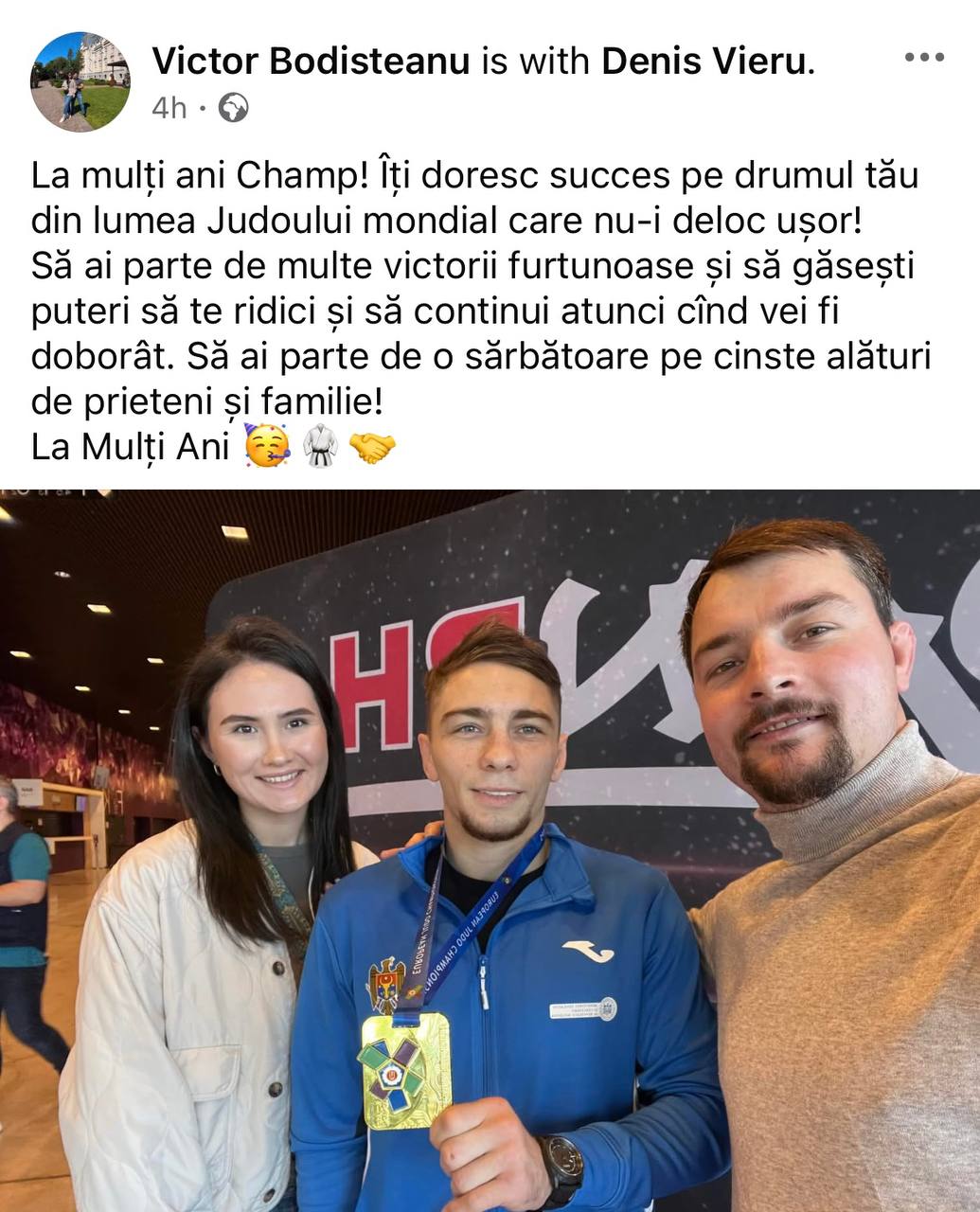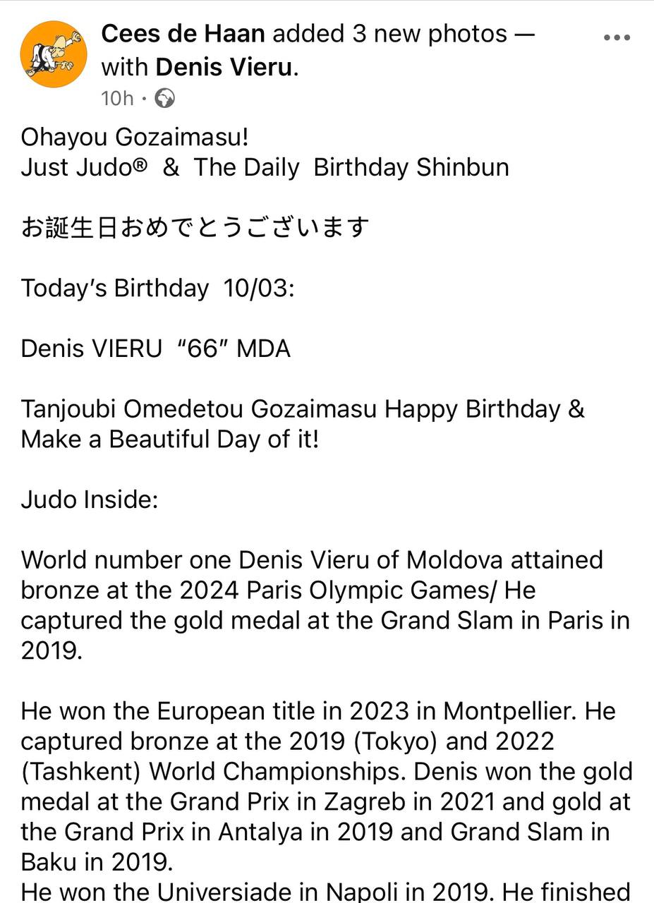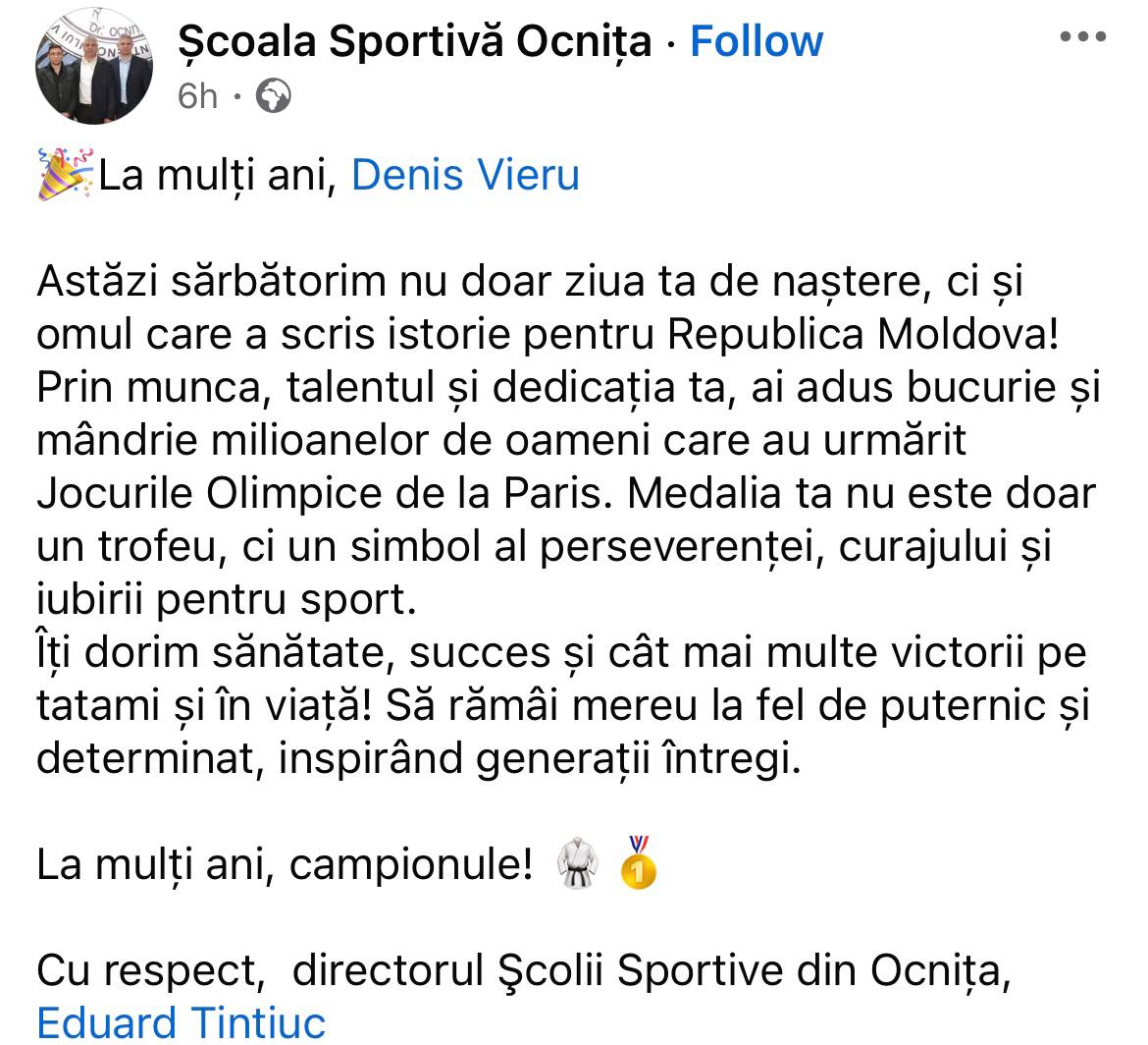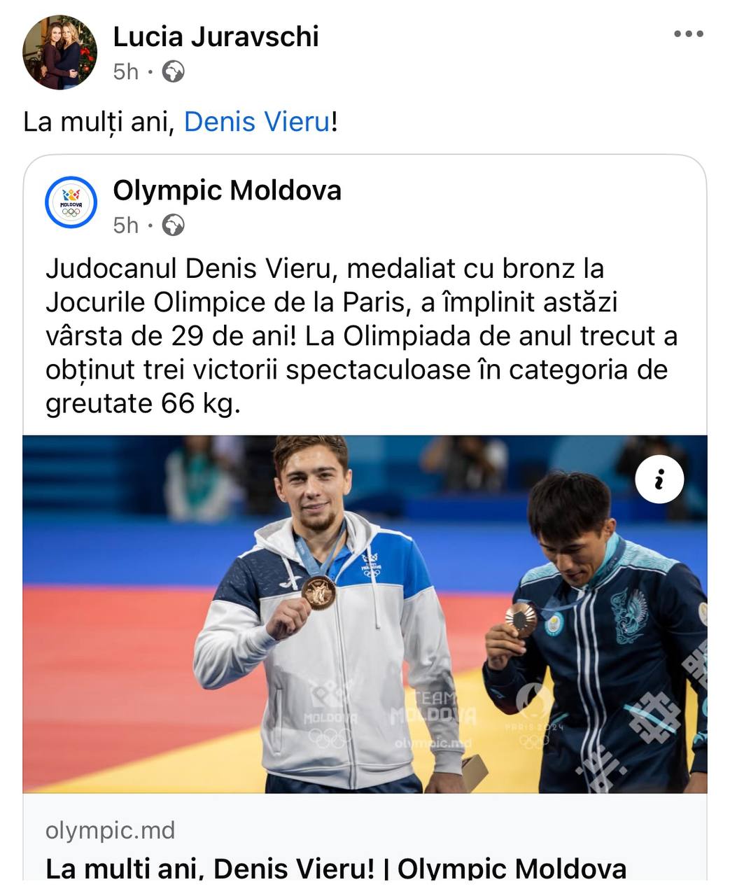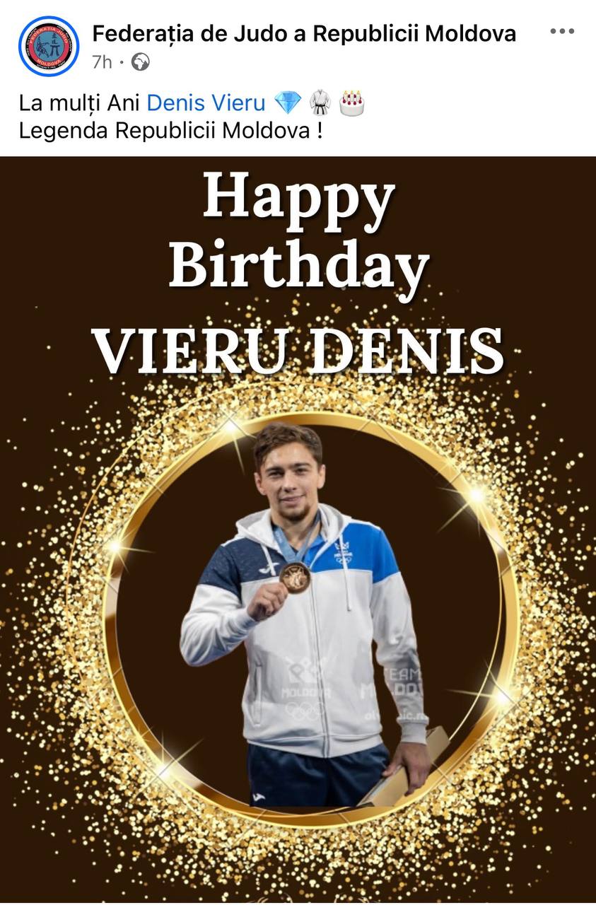 „Judocanul Denis Vieru, medaliat cu bronz la Jocurile Olimpice de la Paris, a împlinit astăzi vârsta de 29 de ani! La Olimpiada de anul trecut a obținut trei victorii spectaculoase în categoria de greutate 66 kg.”