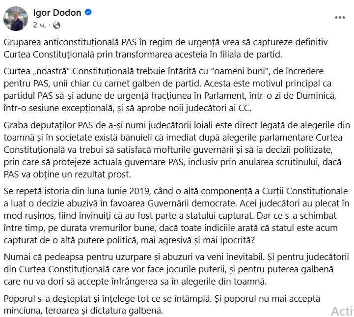 „Gruparea anticonstituțională PAS în regim de urgență vrea să captureze definitiv Curtea Constituțională prin transformarea acesteia în filiala de partid.
