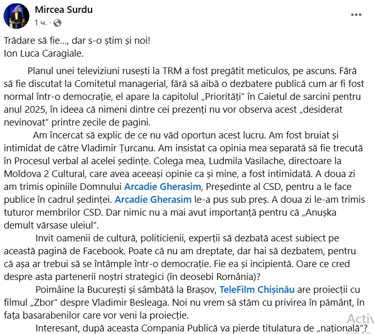 Planul unei televiziuni rusești la TRM a fost pregătit meticulos, pe ascuns. Fără să fie discutat la Comitetul managerial, fără să aibă o dezbatere publică cum ar fi fost normal într-o democrație, el apare la capitolul „Priorități” în Caietul de sarcini pentru anul 2025, în ideea că nimeni dintre cei prezenți nu vor observa acest „desiderat nevinovat” printre zecile de pagini.