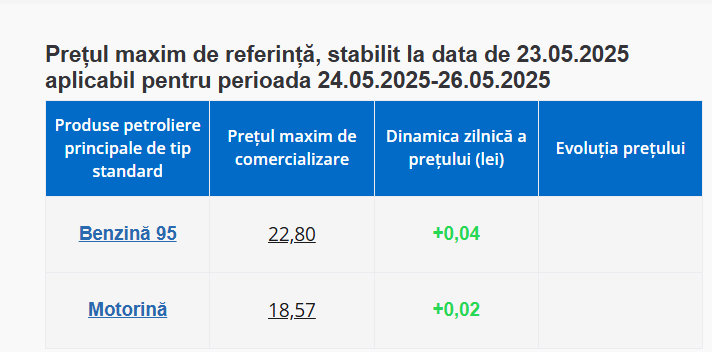 Prin urmare, în perioada 24.05.2024-26.02.2024, un litru de benzină va costa 22,80 lei, iar un litru de motorină va avea prețul de 18,57 lei.
