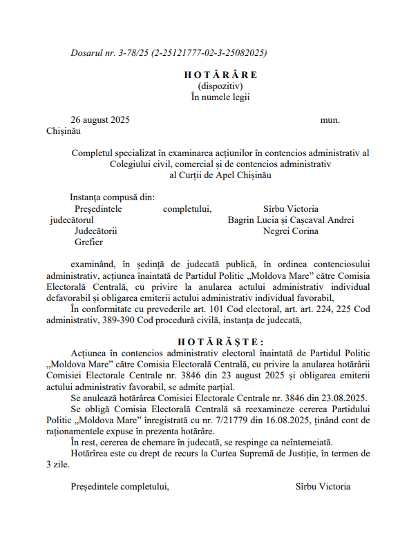 „Se anulează hotărârea Comisiei Electorale Centrale nr. 3846 din 23.08.2025.
