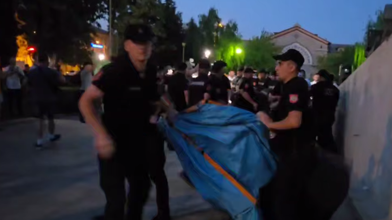 Momentul în care oamenii legii demontează corturile protestatarilor:
