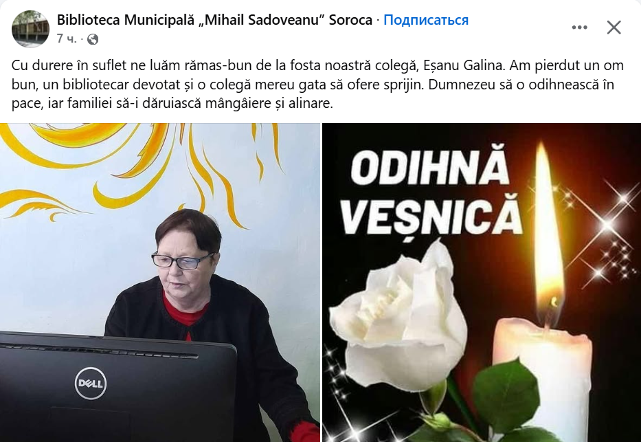 Reprezentanții Bibliotecii Municipale „Mihail Sadoveanu” din Soroca anunță trecerea în neființă a fostei sale colege, Eșanu Galina. Colectivul instituției își exprimă regretul pentru pierderea „unui om bun, a unui bibliotecar devotat și a unei colege care a fost mereu gata să ofere sprijin și încurajare.”