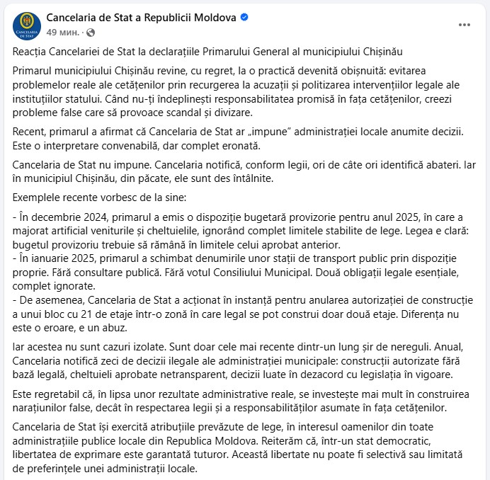 Cancelaria de Stat își exercită atribuțiile prevăzute de lege, în interesul oamenilor din toate administrațiile publice locale din Republica Moldova. Reiterăm că, într-un stat democratic, libertatea de exprimare este garantată tuturor. Această libertate nu poate fi selectivă sau limitată de preferințele unei administrații locale”, se arată în mesajul autorității.