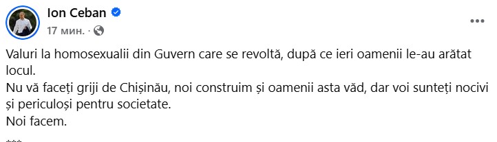 „Valuri la homosexualii din Guvern care se revoltă, după ce ieri oamenii le-au arătat locul. Nu vă faceți griji de Chișinău, noi construim și oamenii asta văd, dar voi sunteți nocivi și periculoși pentru societate. Noi facem”.