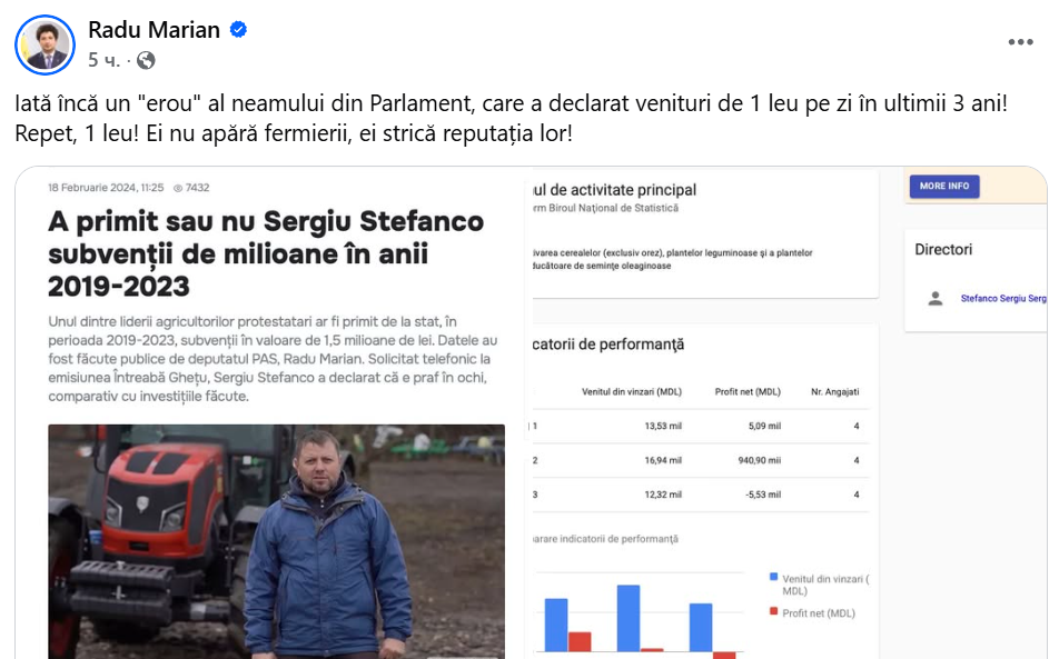 „Iată încă un „erou” al neamului din Parlament, care a declarat venituri de 1 leu pe zi în ultimii 3 ani! Repet, 1 leu! Ei nu apără fermierii, ei strică reputația lor!”, a scris deputatul PAS, Radu Marian.