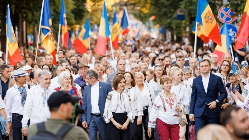 Președinta Maia Sandu și Ion Hadîrcă, poet și fost deputat în Parlamentul RM sunt în fruntea participanților la Marșul Suveranității, care se îndreaptă spre Președinție. Speakerul Igor Grosu și premierul Dorin Recean sunt și ei prezenți.