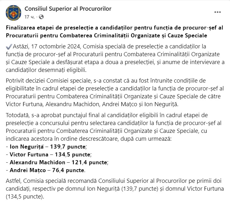 „Potrivit deciziei Comisiei speciale, s-a constat că au fost întrunite condițiile de eligibilitate în cadrul etapei de preselecție a candidaților la funcția de procuror-șef al Procuraturii pentru Combaterea Criminalității Organizate și Cauze Speciale de către Victor Furtuna, Alexandru Machidon, Andrei Mațco și Ion Neguriță.