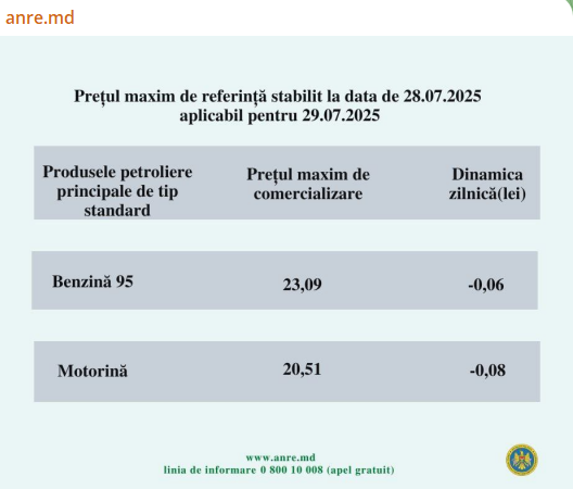 Astfel, litrul de benzină va costa 23,09 lei, iar cel de motorină - 20,51 lei.