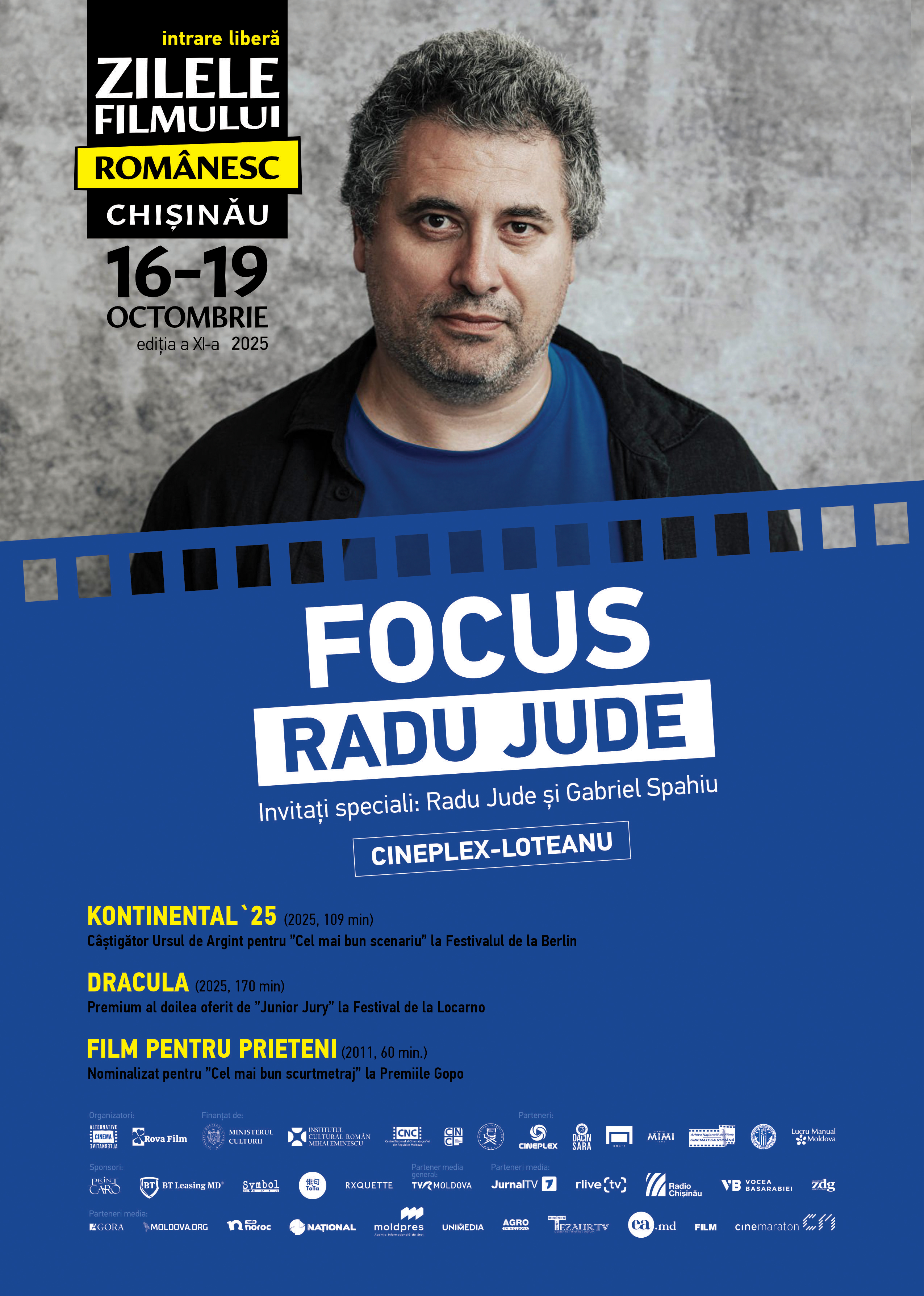 Secţiunea FOCUS din acest an îi este dedicată regizorului Radu Jude, care va fi celebrat prin proiectarea a trei filme: “Kontinental `25” (2025), premiat cu Ursul de Argint pentru cel mai bun scenariu Festivalul de la Berlin, “Dracula” (2025), care a făcut parte din competiţia Festivalului de la Locarno, şi “Film pentru prieteni” (2011). Proiecţiile vor fi urmate de câte un interviu video înregistrat cu regizorul Radu Jude, realizat special pentru publicul de la ZFR, dar şi de discuţii cu celebrul actor Gabriel Spahiu, care joacă în toate cele trei filme şi care va fi prezent la Chişinău.