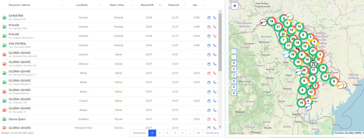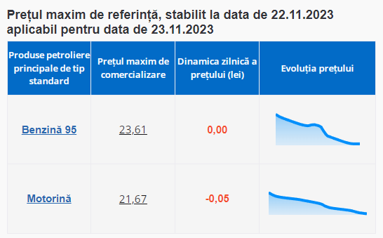 Astfel, joi, șoferii vor putea procura benzina cu cifra octanică 95 la un preț maxim de 23,61 lei per litru, iar motorina - cu 21,67 lei per litru.