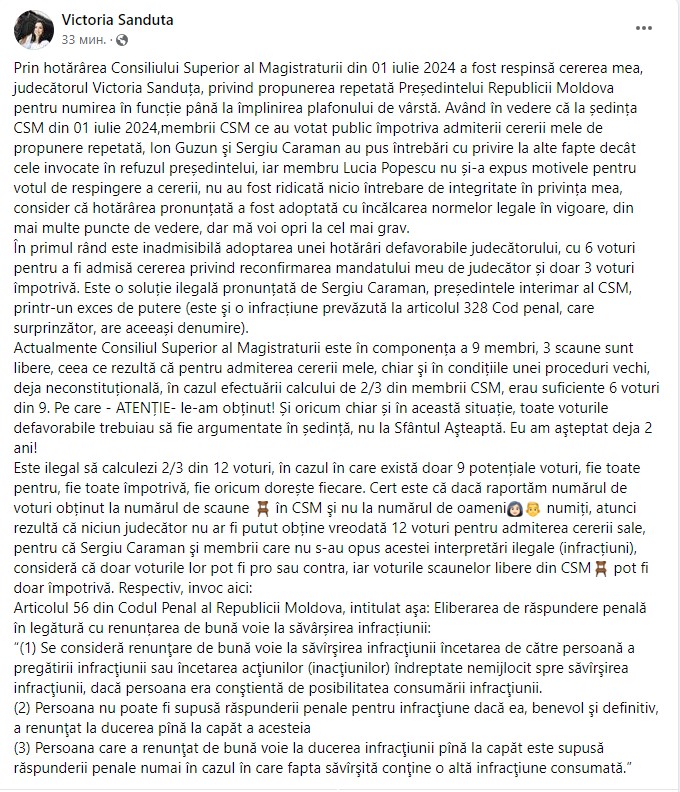 „Prin hotărârea Consiliului Superior al Magistraturii din 01 iulie 2024 a fost respinsă cererea mea, judecătorul Victoria Sanduța, privind propunerea repetată Președintei Republicii Moldova pentru numirea în funcție până la împlinirea plafonului de vârstă. Având în vedere că la ședința CSM din 01 iulie 2024, membrii CSM ce au votat public împotriva admiterii cererii mele de propunere repetată, Ion Guzun şi Sergiu Caraman au pus întrebări cu privire la alte fapte decât cele invocate în refuzul președintelui, iar membra Lucia Popescu nu și-a expus motivele pentru votul de respingere a cererii, nu a fost ridicată nicio întrebare de integritate în privința mea, consider că hotărârea pronunțată a fost adoptată cu încălcarea normelor legale în vigoare, din mai multe puncte de vedere, dar mă voi opri la cel mai grav.