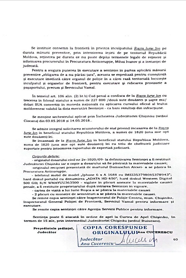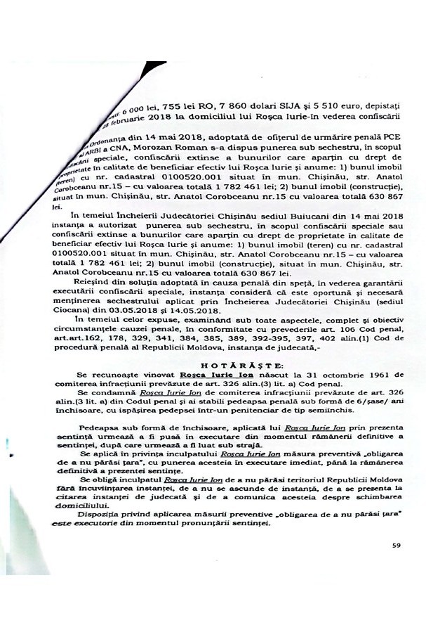 „Se aplică în privința inculpatului Rosca Iurie Ion măsura preventivă - obligarea de a nu părăsi țara. cu punerea acesteia în executare imediat, până la rămânerea definitivă a prezentei sentinţe.
