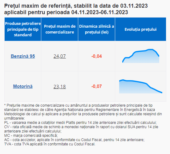 În aceste condiții, pornind de la algoritmul de stabilire a prețurilor bazat pe valoarea medie a cotațiilor Platts pentru 14 zile anterioare corelată la cursul de schimb leu/dolar, pentru perioada 04.11.2023-06.11.2023 ANRE a stabilit următoarele prețuri maximale de comercializare cu amănuntul a produselor petroliere principale de tip standard: