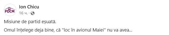 Omul înțelege deja bine că „loc în avionul Maiei” nu va avea”, a scris Chicu pe rețele.
