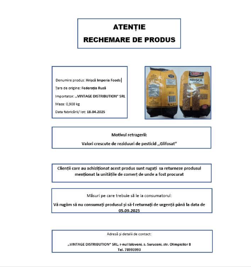 Potrivit Agenția Națională pentru Siguranța Alimentelor, motivul retragerii este - valoarea crescută a rezidurilor de pesticid „Glifosat”.