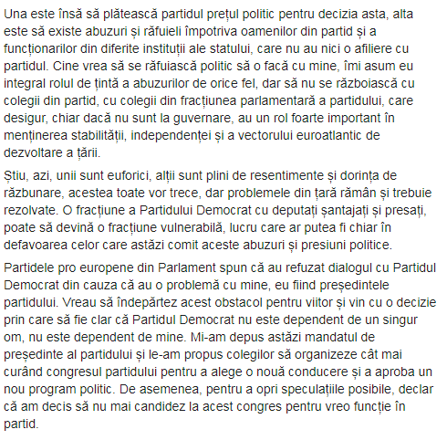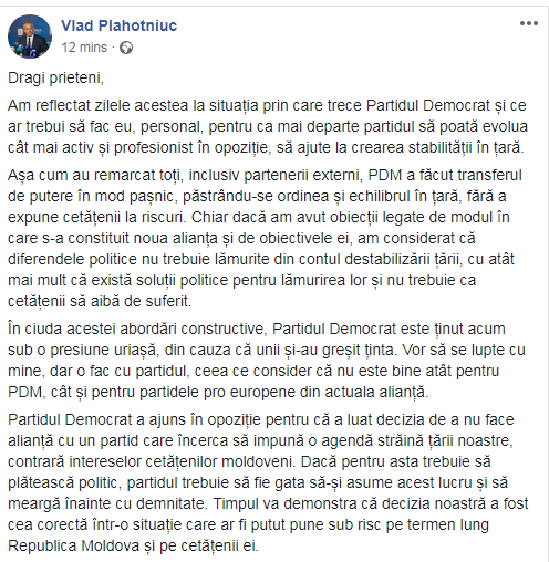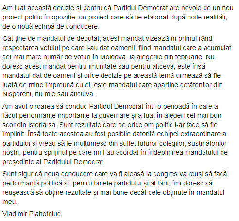 „Mi-am depus astăzi mandatul de președinte al partidului și le-am propus colegilor să organizeze cât mai curând congresul partidului pentru a alege o nouă conducere și a aproba un nou program politic. De asemenea, pentru a opri speculațiile posibile, declar că am decis să nu mai candidez la acest congres pentru vreo funcție în partid”, a scris Vlad Plahotniuc.