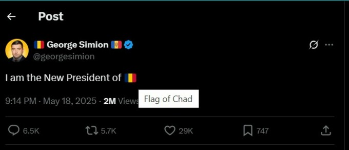 „I am the New President of” (”Sunt noul președinte al”, în traducere, n. red.), a scris Simion pe X.com, după care a pus un emoji cu drapelul Ciadului.